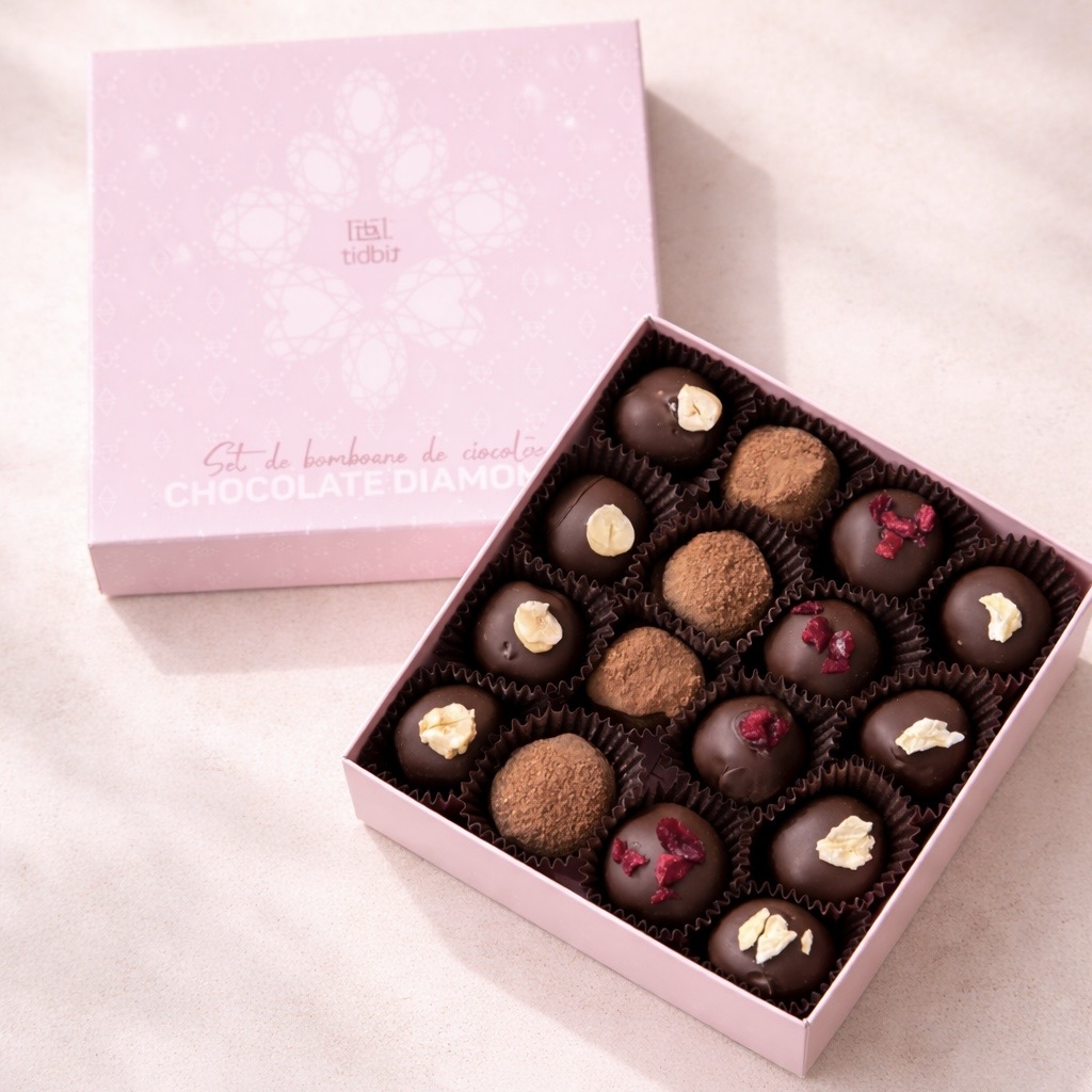 • Trufă „Cafea & Alună” – mix vibrant de alună și notă de cafea, cu textură fină de ciocolată.